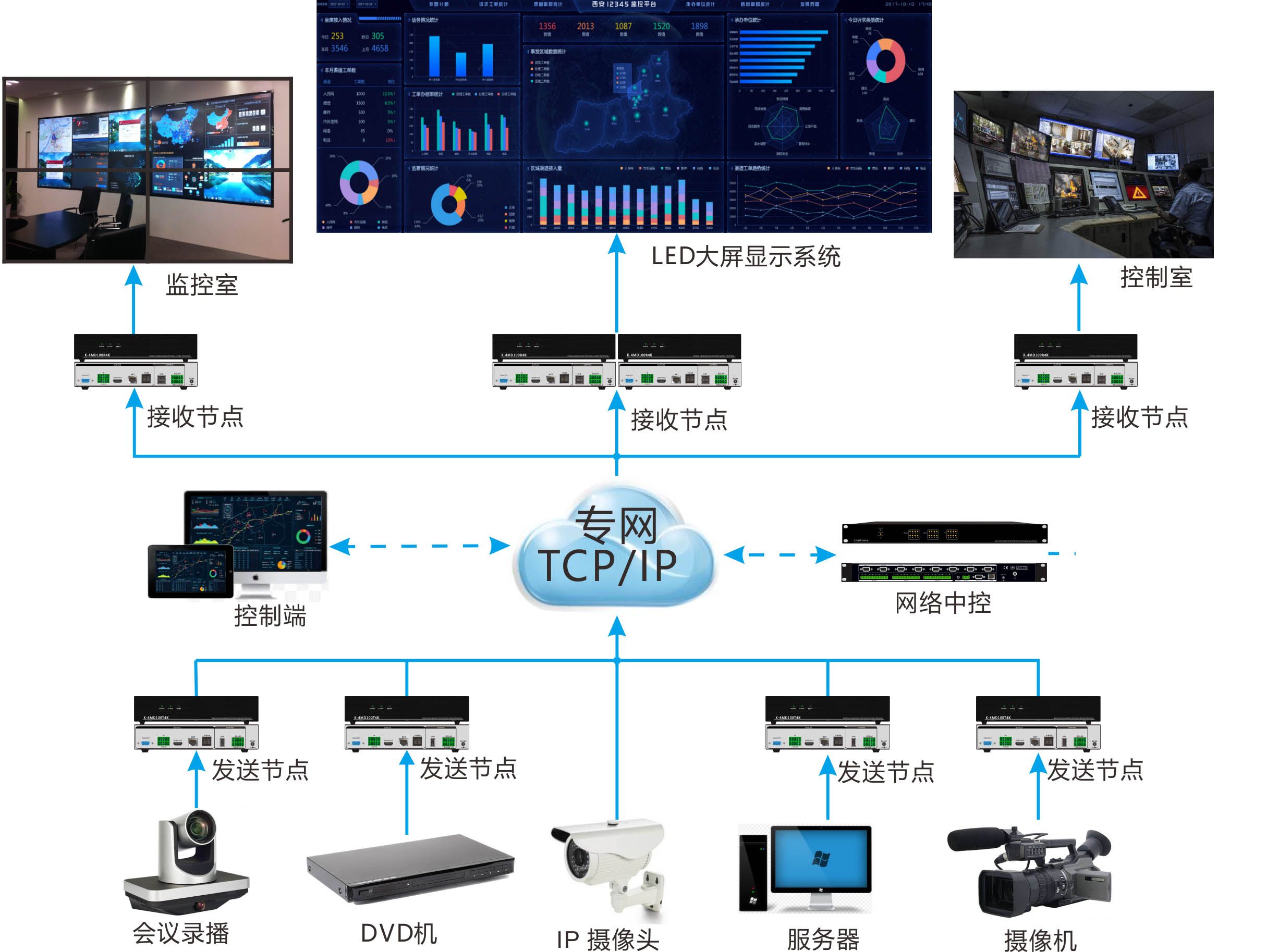 分布式中控系統是通過(guò)網(wǎng)絡(luò )進(jìn)行部署,通過(guò)管理平臺對 指揮中心 多個(gè)會(huì )議室進(jìn)行單獨、統一控制管理 , 通過(guò)PC、IPAD等控制終端對會(huì )議室設備進(jìn)行智能化統一管控 。