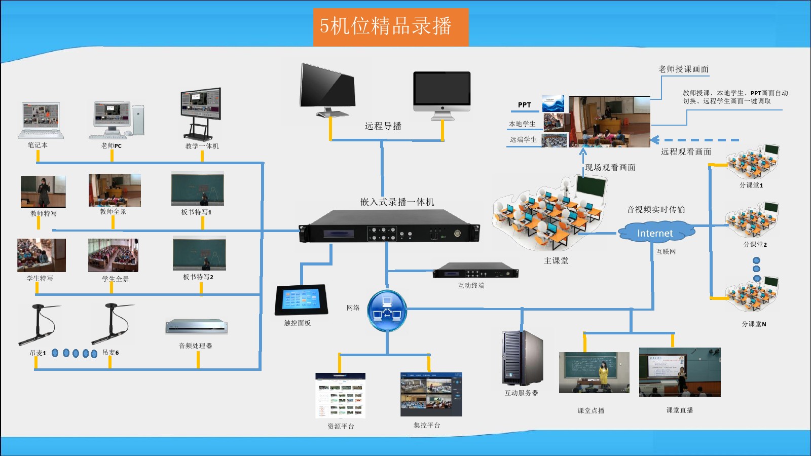 自主研發(fā)的錄播主機,內置互動(dòng)模塊,一臺錄播機即可完成課程錄制,互動(dòng)課堂的功能。實(shí)現不教室上同上一堂課的教學(xué)目的。