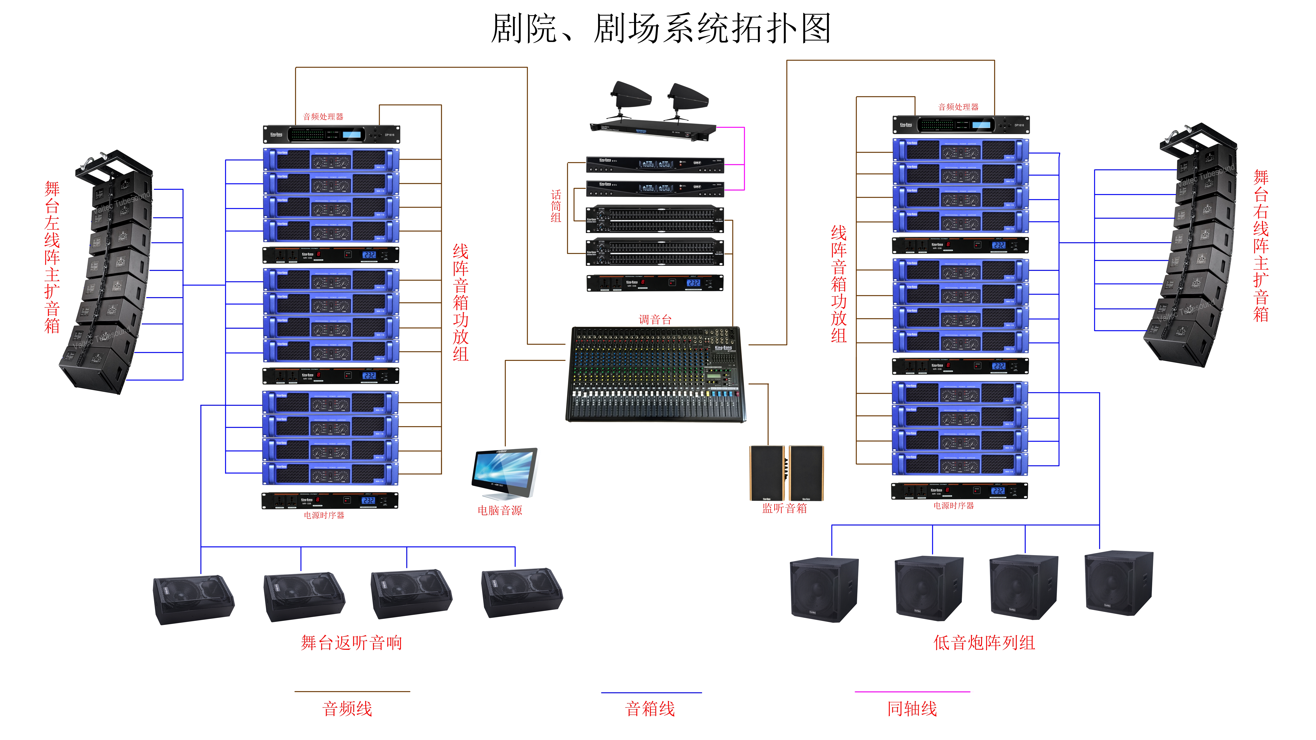 劇院的觀(guān)眾廳擴聲系統,舞臺返送監聽(tīng)系統,以及控制室監聽(tīng)系統。