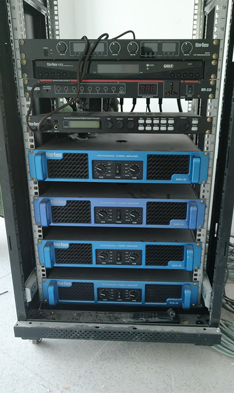 放大設備——指對經(jīng)過(guò)調控設備混音輸出、信號處理后的信號進(jìn)行后級功率放大設備,這里指專(zhuān)業(yè)功率放大器;重放設備——指將經(jīng)過(guò)后級功率放大器放大的音頻信號進(jìn)行電—聲轉換并釋放表現出來(lái)人耳可懂的聲頻信號的設備,這里指揚聲器;