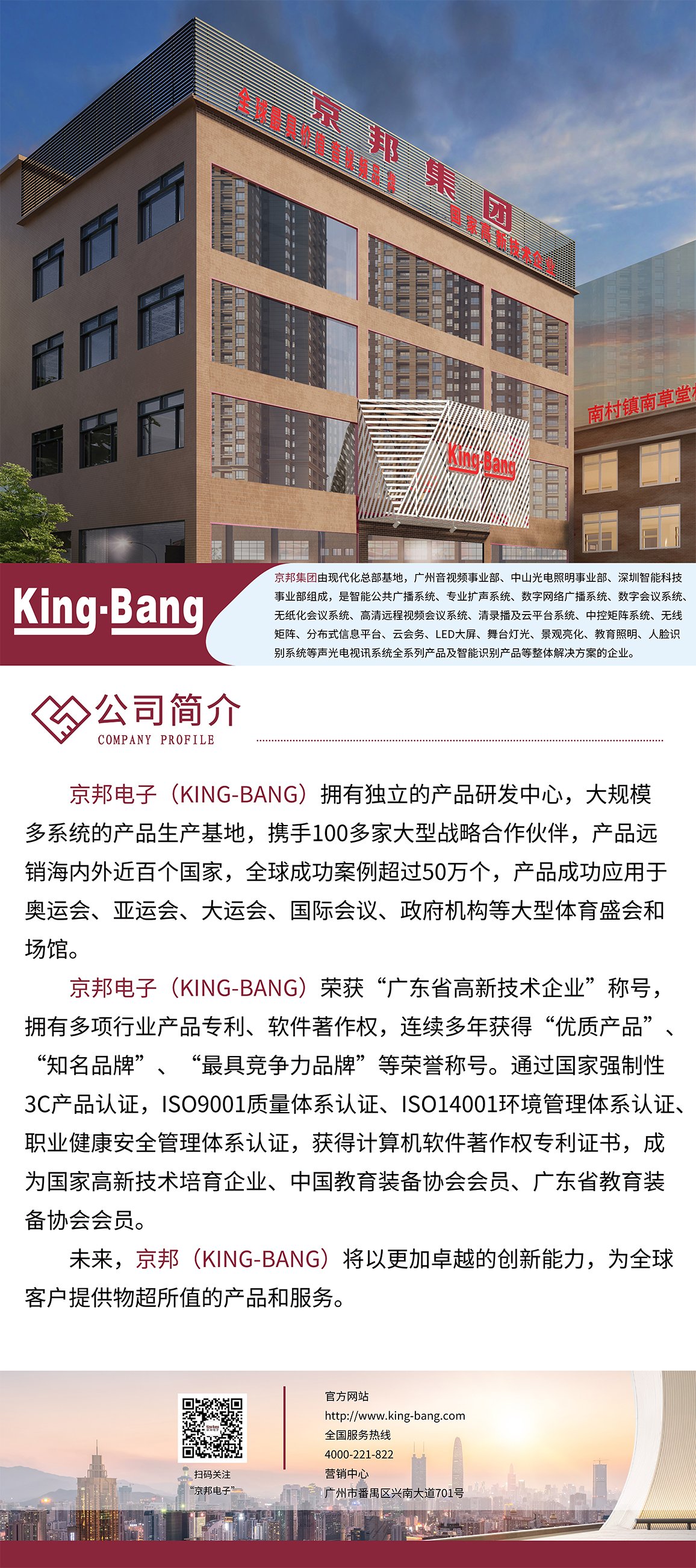 廣東京邦智慧科技集團有限公司自成立以來(lái),一直專(zhuān)注于數字音視頻技術(shù)的研發(fā)和應用,不斷提升自身技術(shù)水平和創(chuàng )新能力。經(jīng)過(guò)多年的努力,公司已經(jīng)發(fā)展成為國內數字音視行業(yè)的領(lǐng)軍企業(yè),產(chǎn)品和服務(wù)覆蓋了會(huì )議、公共廣播、擴音等多個(gè)領(lǐng)域。